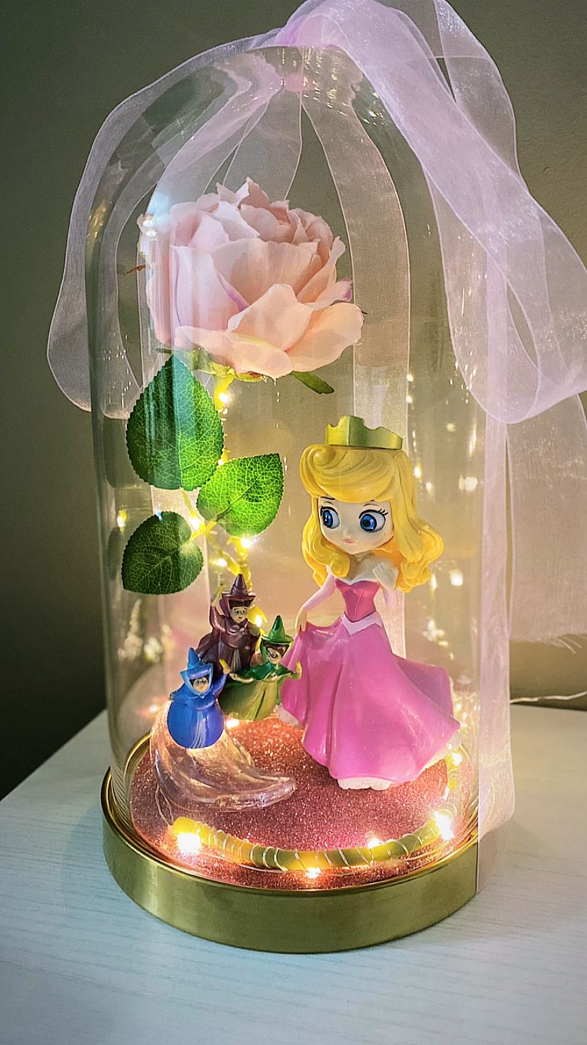 Dentro de una delicada cúpula de cristal, esta figura recrea un momento lleno de ternura y fantasía. Las hadas rodean a la princesa mientras pequeñas flores, césped artificial y una suave luz LED envuelven la escena con un brillo mágico. El lazo decorativo en la parte superior le da el toque final de cuento.