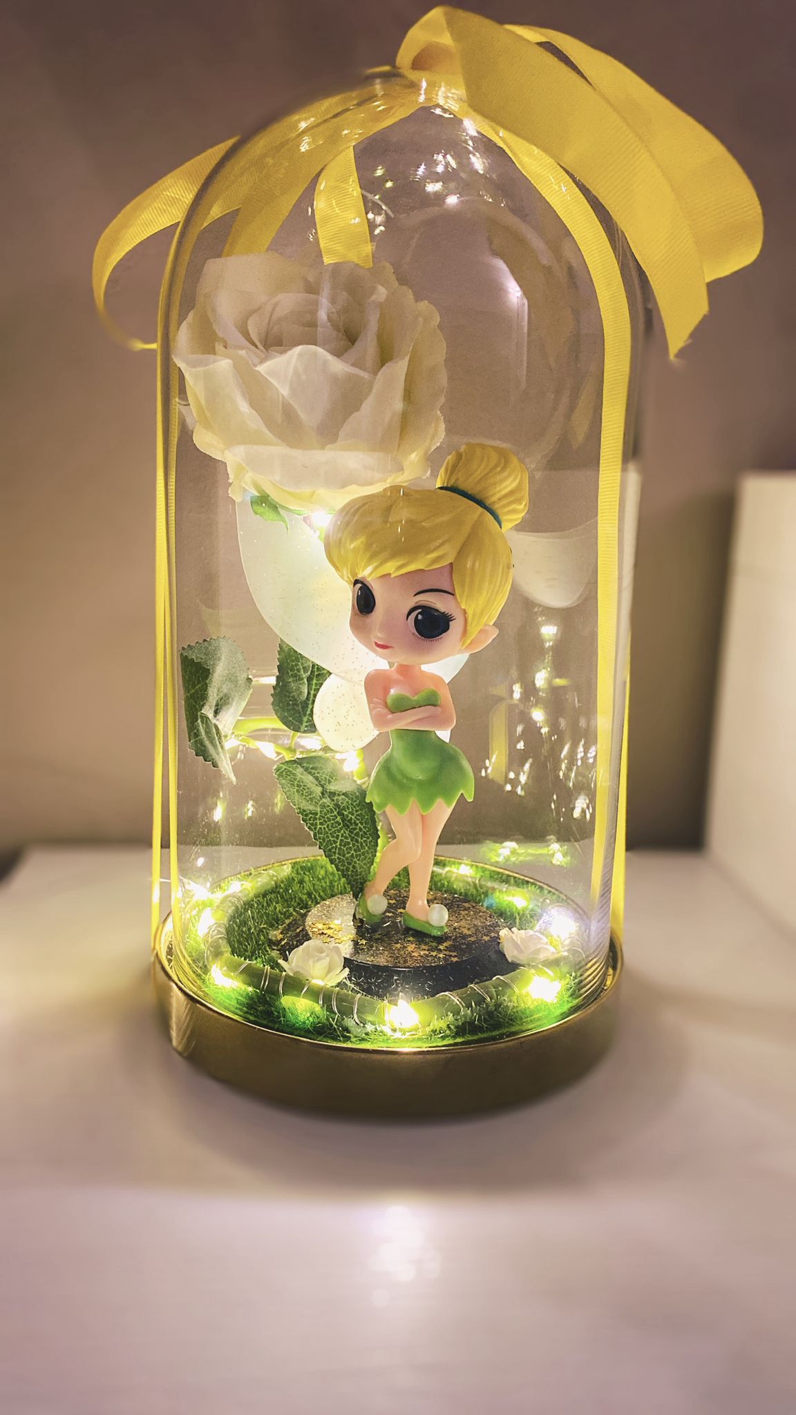 Perfecta para regalar o para embellecer tu espacio con un toque de fantasía, esta cúpula combina lujo, nostalgia y artesanía. La base forrada en césped artificial y las pequeñas flores blancas crean un ambiente mágico que da vida a esta icónica hada de Nunca Jamás.