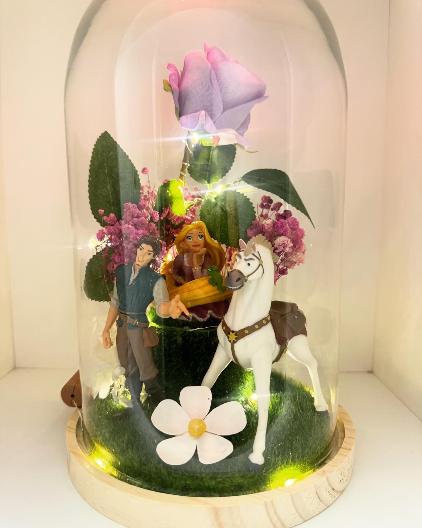 Cúpula de cristal con rosa y flores artificiales, luz led y figuras de la película.